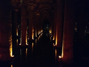 Then it was on to the cisterns, built by the Byzantine emperor, Justinian, they supplied water for the Hagia Sophia. They are deep underground and for years they had been filled with garbage and forgotten. Finally they were rediscovered, cleaned out, and opened to the public. I’m told they even hold concerts in them. The pictures turned out pretty dark but yes, those are fish swimming in there!