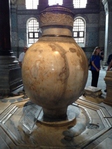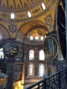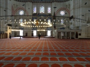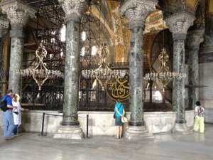 This mosque was built to rival Hagia Sophia which is right across the park from it. It was commissioned by Sultan Mehmed who was suppose to be rather absent minded (Katie, you will like this story). At the Sultan’s entrance there is a chain part way up. It is to prevent the Sultan from forgetting to dismount and riding his horse into the mosque courtyard. It is built by a student of Sinan, 1100 years after San Sofia (Hagia Sophia, this building has three different names, four with the translation, “Holy Wisdom”). The dome of the Blue mosque stands on elephant legs, four marble pillars. It would have been lit with olive oil lamps.