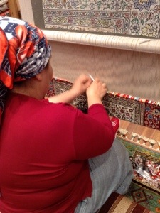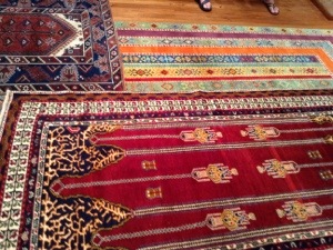 I’m attaching some random pictures. One is of the fish from the Seafood restaurant under the bridge. Some are of the excellent food we had at an Armenian restaurant and a few of the mosaics at a Greek Orthodox church now the Chora Museum, the bus doing a U-turn in the middle of traffic, Taksim Square, and an Afghan War rug woven in the 1980’s when they were fighting the Soviet Union. It has guns in it!