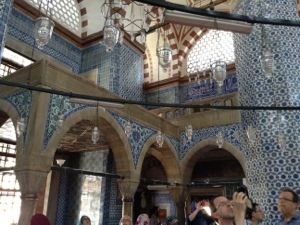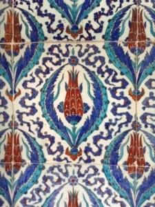 So, today we went to the Blue Mosque. It is called this because the tiles inside are the famous Iznik blue tiles. It was so crowded with tourists that it made me really appreciate the mosques we visited in the other towns. Yes, it is beautiful but it still doesn’t compete with the Selimiye Mosque in Edirne. So, as we get close to the entrance there are racks of robes with scarves and two guys telling people to take one or motioning them through if they are dressed appropriately. I Passed The Test!