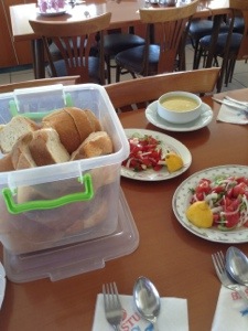 Fresh fruit and vegetables everywhere! There is incredible variety; the juiciest watermelon, rich apricots, ripe mouthwatering peaches, black cherries, grapes, cucumbers, tomatoes, lettuce (no yucky iceberg in site), very mild onions. There were food stands all along the road on the way here.